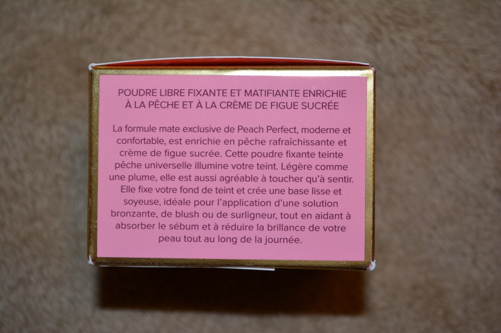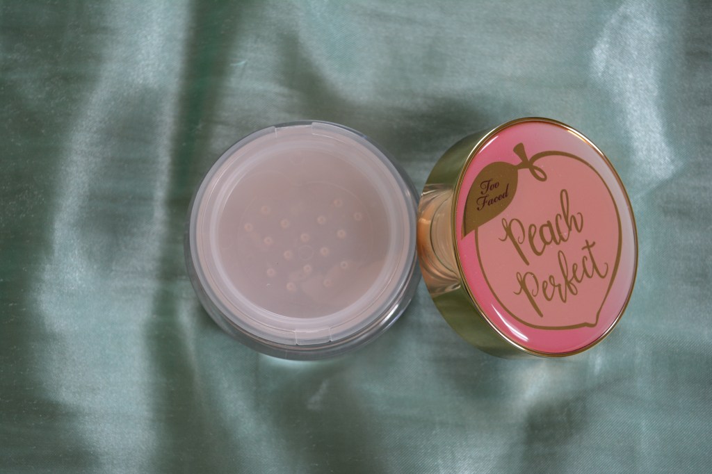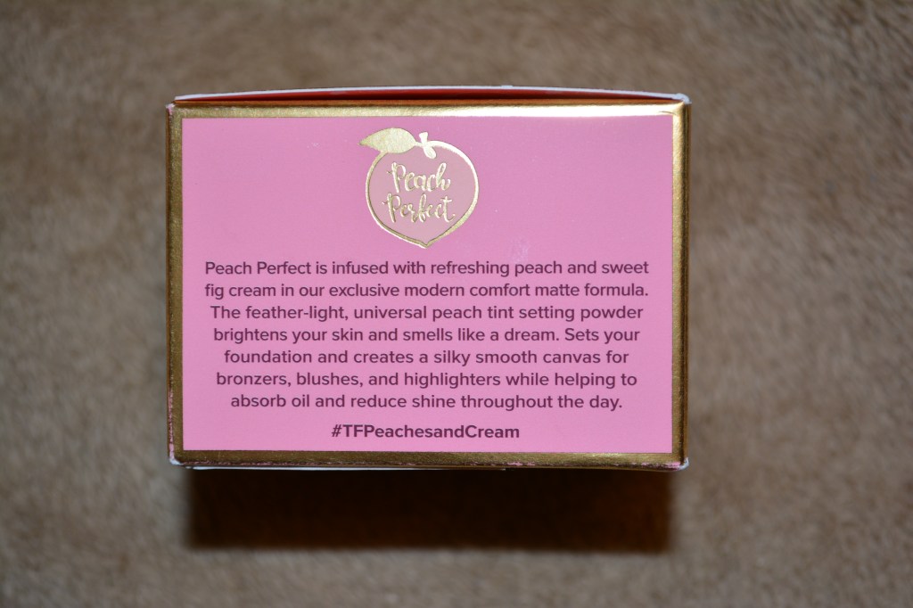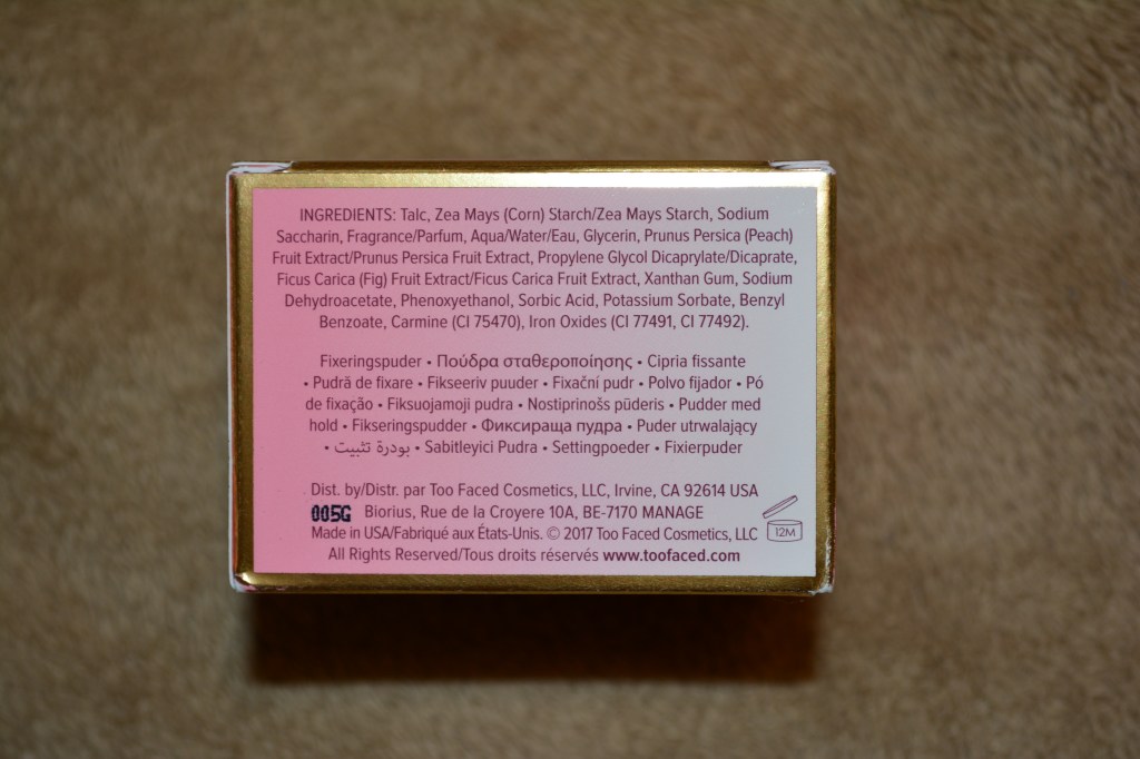 There are tons of things I love about this packaging, from the sifter to the peach accents. For starters, the jar it comes in being clear is a win, because it’s easier to gauge when it’s time to replace the product than other powder products that don’t have clear packaging. Next, the peach detail on the lid is an adorable addition and plays well into the peach personality that the collection has in the company. Opening it, you’ll find the biggest setting powder packaging win of all, a re-sealable sifter! One of my biggest pet peeves with powder products is when they have sifters with the plastic film that you have to peel to get product out, but form there on, it’s a gamble on how much product is going to make a mess as soon as you open the jar to use it. The re-useable sifter lid is attached to the sifter itself, so you don’t have to worry about losing it and the peach imprint in it is the most adorable bonus.